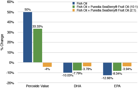 To further investigate this, our R&D team combined fish oil with sea buckthorn oil and researched on its thermal stability. The mixture was heated to 105 °C for 1 hour to speed up the oxidation process. The result showed that the mixture is 54% lower in peroxide value and loss in DHA (6.25% less) and EPA (8.72% less) is reduced, when compared with pure fish oil.