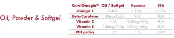 With our advanced supercritical CO₂ extraction and purification technology, CardiOmegia™ offers up to 45% Omega 7 in its natural triglyceride form, which is up to 4.5X higher when compared with other Omega 7 source.